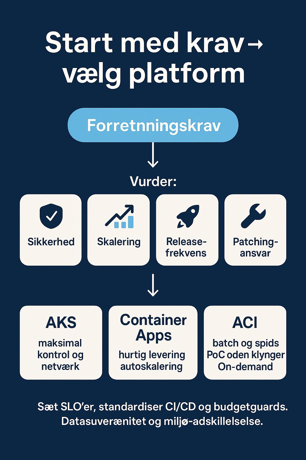 Start med forretningskravene og beslut derefter teknik: sikkerhed, skaleringsbehov, SLA og ansvar for patching.
